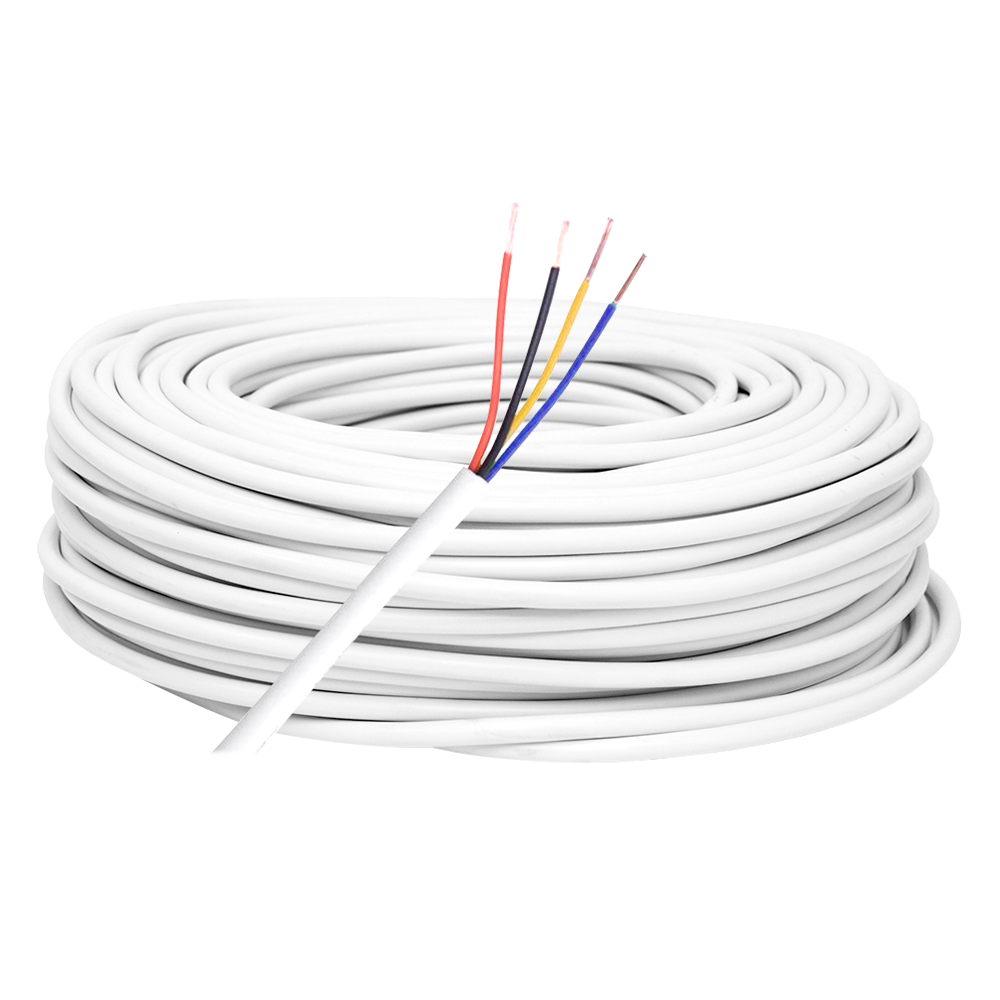 Bobine de câble-100 m-Alarme-4 conducteurs-Conducteur interne Classe 5 Cuivre électrolytique flexible 0,22 mm-Isolation PE-Ecran Polyester aluminium avec 96% couverture+ drainage CuSn-Couverture Polyoléfine FRLSHF 6.1 mm-Sans halogène-Certificat CPR Cca -1sb, a1, d2.