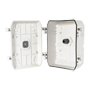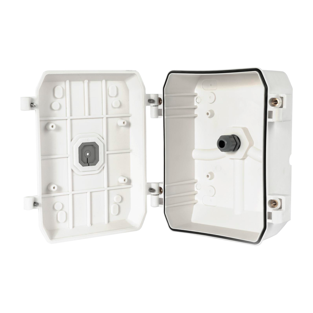 Boîte de jonction pour caméras dôme-Diamètre 50 ~ 77 mm-Plastique-Utilisable en extérieur -Permet de situer le passage du câblage à l’intérieur-Niveau pour positionnement correct inclus-Double étanchéité pour l’extérieur-Contient un aimant pour fixer les vis-200 (Ht) x 150 (lg) x 85 (Lg) mm-Couleur blanche.
